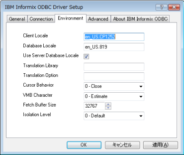 (3)Environmentタブを選択し、「Client Locale」に使用するクライアントロケール名、「Database Locale」に使用するデータベースロケール名を入力し、「OK」ボタンを選択してダイアログを閉じます。 |