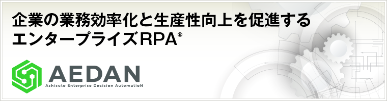 AEDANは、定型・反復型で単純なPC作業の自動化のみならず、少々高度な業務上の判断をも包括し、エンタープライズレベルで自動化してゆく「エンタープライズRPA®」 ソリューションです。