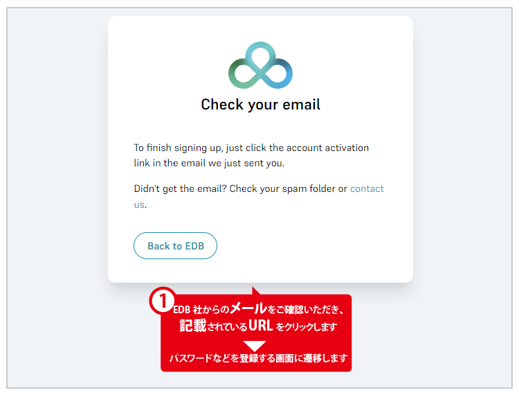EDB社から【EDB: Activate Your Account】という件名のメールが届くので、メール内のURLをクリックしてアカウントをアクティベートします。