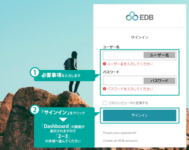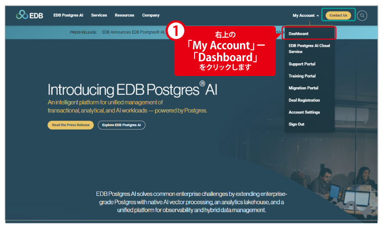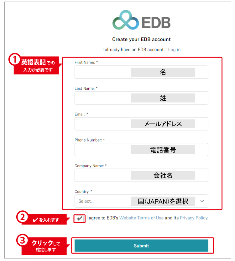 EDB社のウェブサイトにアクセスし、EDBアカウントを作成します。