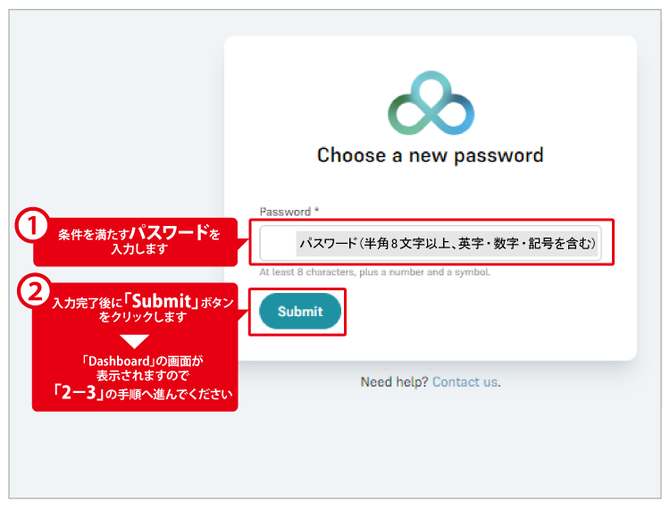 パスワードは最低8文字以上、文字・数字・記号を含めて設定してください。入力完了後に「Submit」ボタンをクリックして保存します。