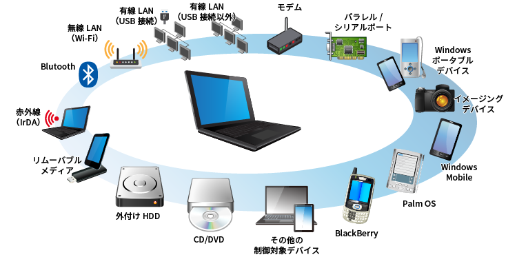 スマートフォン、USBメモリなどのリムーバブルメディア、有線/無線LANといった通信機能など、様々なデバイスの利用をPC毎に制限し、ユーザによる不正なデータ持ち出しを防止します。