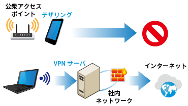 ネットワーク接続をする場合は、自社設置のアクセスポイントなど、許可されたアクセスポイントのみ利用を許可します。社外からの場合は、安全なVPN接続を強制します。こうして接続先ネットワークをコントロールすることで、私物スマートフォンなどのテザリング機能を使ったインターネットへの直接接続を防ぎます。