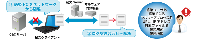 また、マルウェア検出製品のログと、秘文のログとの突き合わせ解析をすることで、漏洩した可能性のあるファイルの特定を容易にします。
