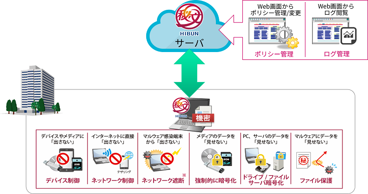 デバイスやネットワーク制御、暗号化機能など、内部不正対策や盗難紛失対策の機能をサービスで提供します。