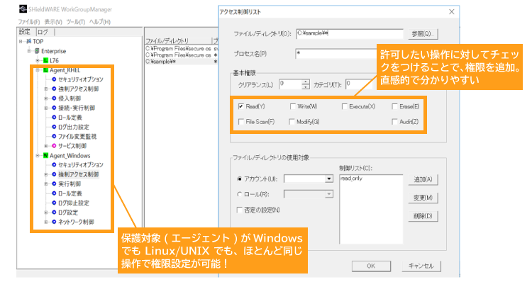 OS上で発生するファイルアクセスにアクセス禁止、許可の制御を行い、不正操作や誤操作を防ぎます。OSとは別の独立した権限設定ができることで、特権IDであっても一般ユーザー同様に制御します。