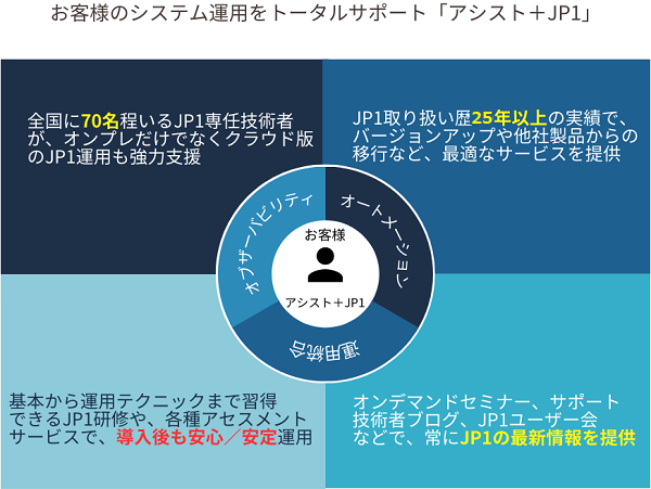 アシストではJP1を利用したITサービス運用の改善検討から導入/利用設計/活用まで、独自のサポートメニューをご用意しています。詳細は 支援サービスページ よりご覧いただけます。
