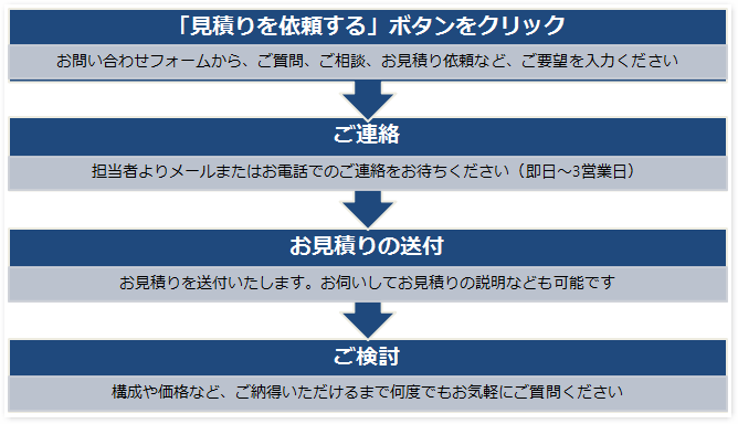 A:概算見積もりは「3営業日」程度を目安としていただいていますが、お急ぎの場合はご相談ください。