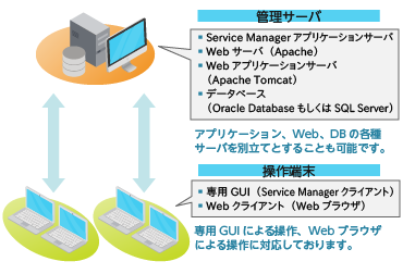 Service Managerは、データベース・サーバ、アプリケーション・サーバ、クライアントGUIの3階層で構成されるソフトウェアです。