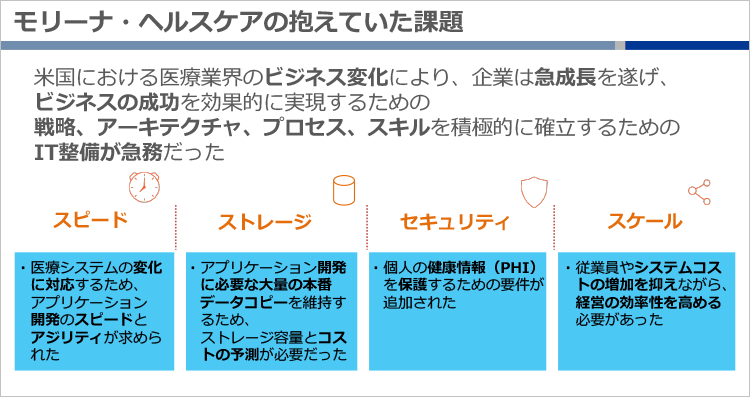 オバマケアが施行された2011年当時、モリーナ・ヘルスケアのITシステムは様々な課題に直面していました。第一に、アプリケーション開発スピードの大幅な加速の必要性に迫られていました。医療保険制度の改定と、それに伴う医療業界の大きな環境変化に素早く対応するには、これまでより短い期間でアプリケーションを開発・リリースする必要がありました。