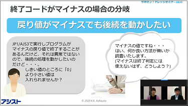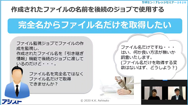 今回のセミナーでは、標準的な機能なのにあまり知られていない便利な機能(リリース機能)や、基本的な使い方しか知られておらず、応用すればより便利に活用できる機能(引継ぎ情報設定ジョブ、待ち合わせ条件)等を使用したジョブの組み方例をご紹介しました。お客様自身でジョブを作成する際のヒントになれば嬉しいです。