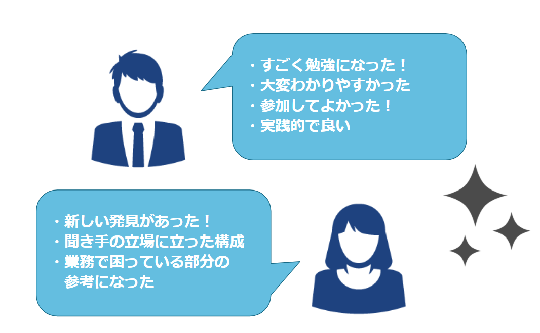 いただいたアンケートコメントをもとに、良い点は継続できるように、そして改善すべき点は改善し、更にお客様のお役に立てるセミナーやコンテンツ提供を目指してサポートセンター一同精進して参ります。