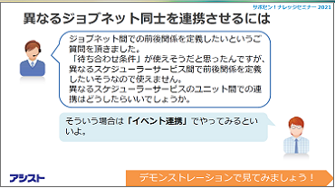今回のセッションでは、JP1/AJS3とJP1/IMの便利機能や、よくご質問のあるトラブルの対応方法をデモンストレーションを交えて6点ご紹介しました。