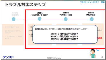 障害が発生した際にまず何をすればいいのか、どこで事象が発生しているのか、その初動と復旧するための応急処置の方法をお伝えし、根本原因を特定するために、どのような内容をサポートセンターに問い合わせれば良いのかをご紹介しました。