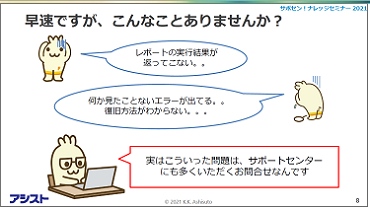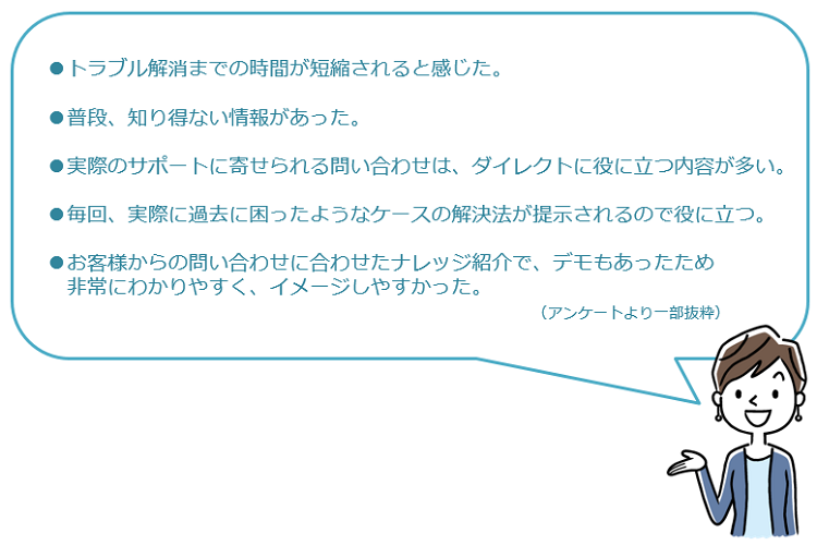 「サポートセンターが日々いただくお問い合わせから得られたナレッジを、お客様に還元する!」というコンセプトでお送りしている本セミナーですが、今年はどんな内容をお届けしたのでしょうか。