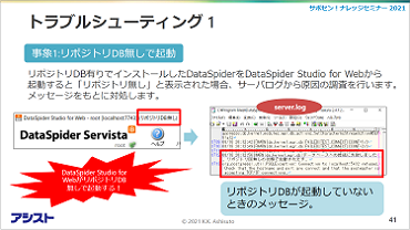 本セッションでは、弊社FAQ参照数ランキングの上位より、DataSpiderの「メモリ」と「バージョンアップ」、「外部アプリケーション起動」に関する製品知識、トラブルを予防するアクションにもつながるログ確認の方法など、DataSpider製品のお役立ち情報をお伝えしました。